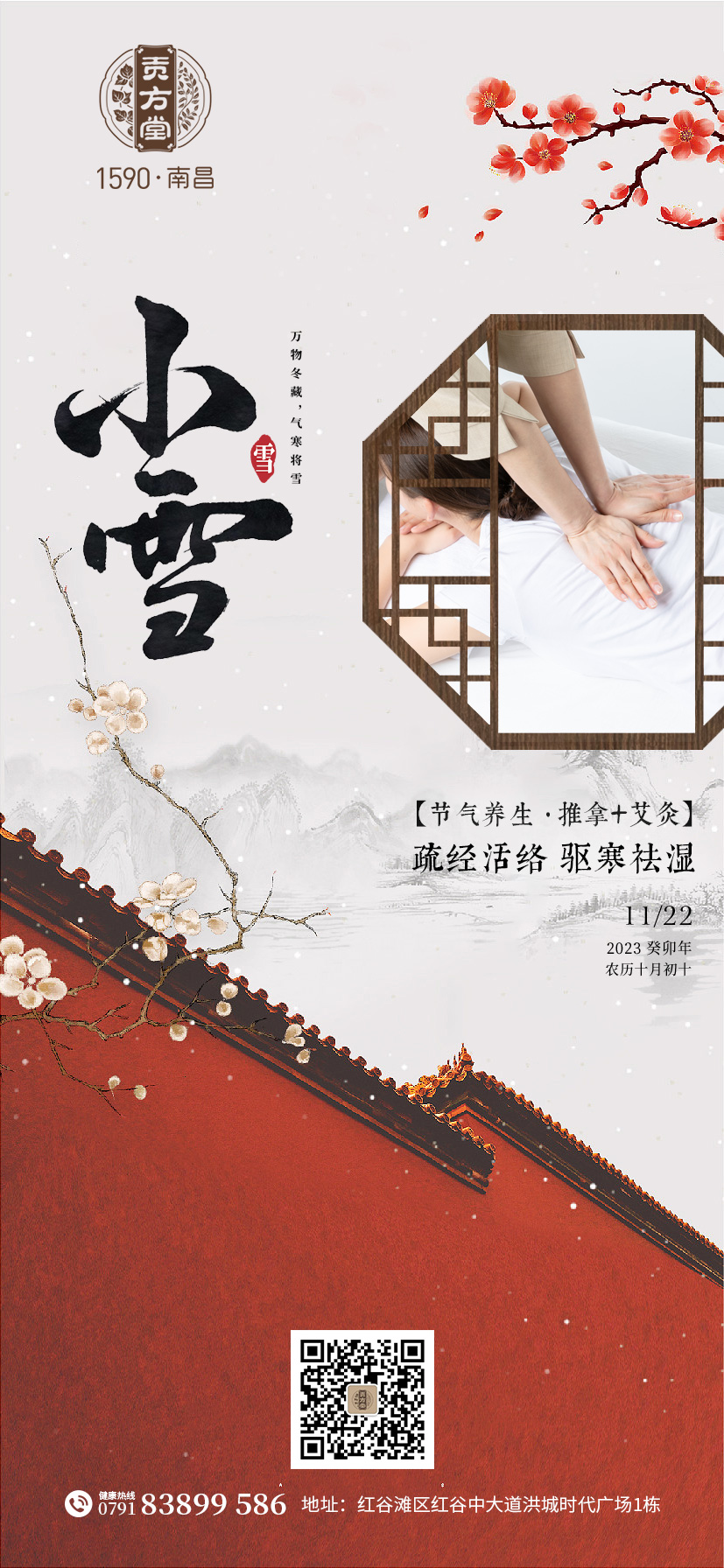 南昌贡方堂贺氏柔按针刺疗法创建人贺绍文教授提醒大家,在小雪节气时,选取具有强身保健作用的穴位施以艾灸,能够起到温阳补气,温经散寒的作用,从而提高机体的抗寒和抗病能力,提高人体免疫能力和对气候变化的适应能力,还具有保健养生的作用。