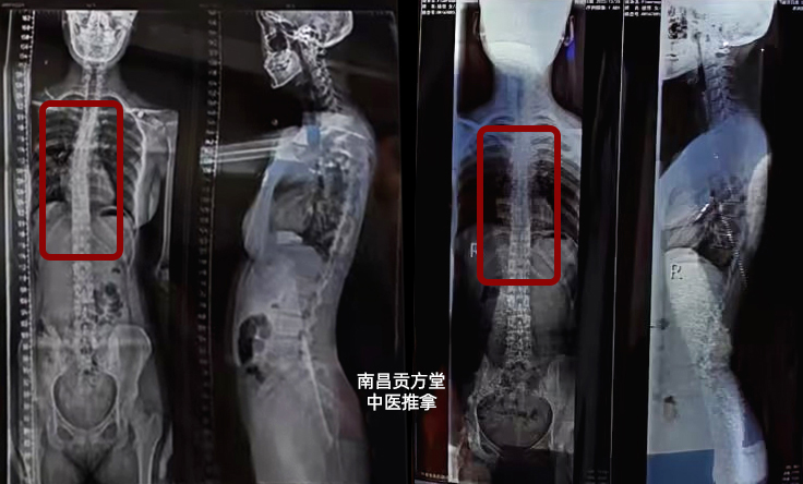 后续治疗:在七次中医正骨推拿治疗疗程结束后,通过X光检查前后对比,其胸椎脊柱侧弯已治愈!且效果稳定!